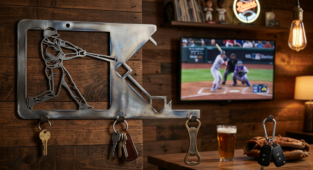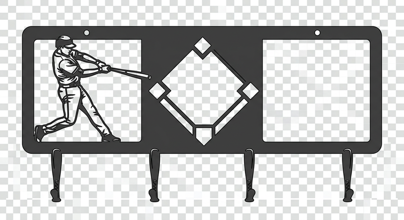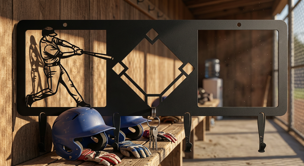 Hit a home run with organization using this Baseball Player Key Holder. A batter ready to swing stands beside bat-shaped hooks perfect for keys, lanyards, and caps. A baseball diamond cutout adds authentic flair. Cut as a single piece with mounting holes. Perfect for baseball players, coaches, sports-themed rooms, and any baseball fan's entryway.