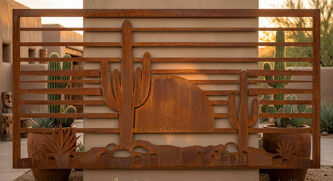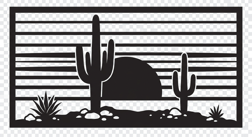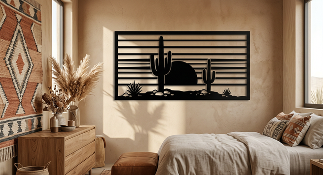 Embrace the desert with this Desert Saguaro Sunset Scene Metal Wall Art. Towering saguaro cacti frame a breathtaking sunset in this iconic Southwestern landscape. The layered sun rays create beautiful light patterns when backlit. Precision-cut as a single connected piece, this sign brings the warmth and tranquility of desert evenings to any room. Perfect for desert lovers, Southwestern-themed spaces, and outdoor patios.