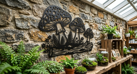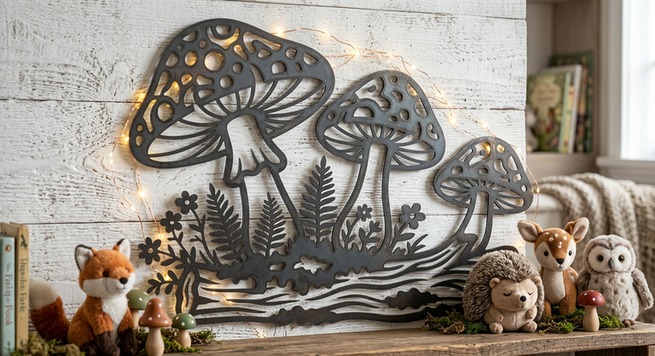 Add woodland magic with this Enchanted Mushroom Cluster Metal Wall Art. Three charming mushrooms of varying sizes emerge from a mossy log, surrounded by delicate ferns and tiny wildflowers. The decorative spotted caps add character to this whimsical design. Cut as a single connected piece, it's perfect for cottagecore décor, children's rooms, gardens, and nature-themed spaces.