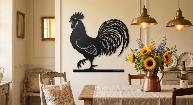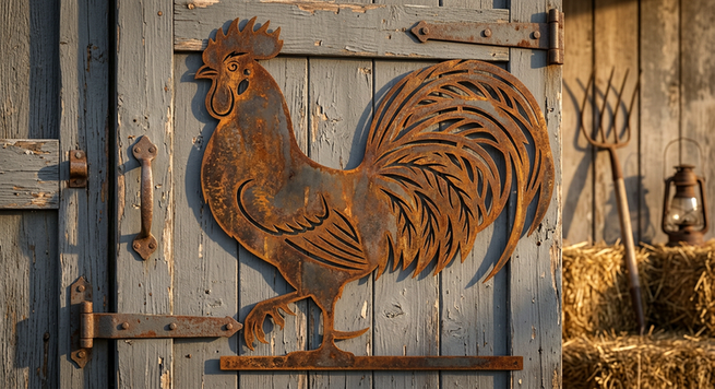 Rise and shine with this Farm Rooster Metal Wall Art. A proud rooster struts with its magnificent flowing tail feathers, detailed comb, and confident stance. Every feather is precision-cut connected as a single piece. This classic farmhouse icon brings country charm to kitchens, dining rooms, barns, and any space celebrating rural life.
