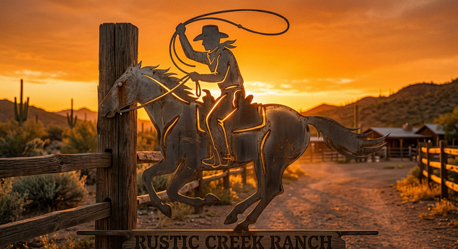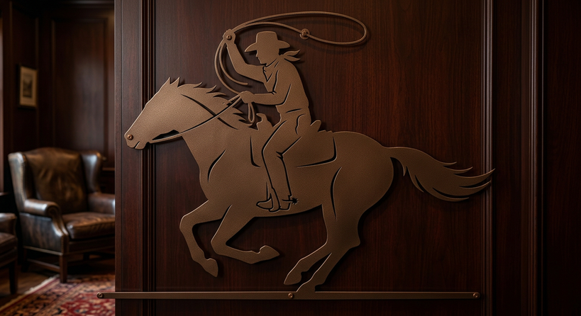 Capture the thrill of the ride with this Galloping Cowboy on Horseback Metal Sign. This dynamic piece shows a cowboy in full gallop, lasso raised high, embodying the spirit of the open range. The flowing horse mane, the rider's hat flying in the wind — every detail is precision-cut from quality steel as one connected piece. Perfect for ranch homes, Western clubs, or anyone who dreams of the cowboy life.