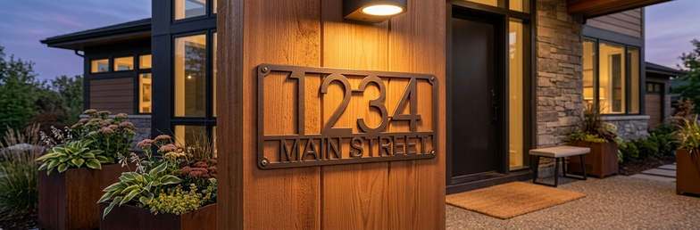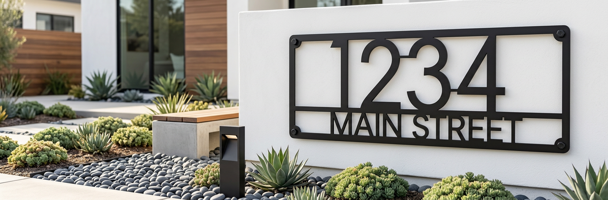Make your home easy to find with this Modern Horizontal Address Plaque. Clean lines and bold numbers in a contemporary font ensure your address is visible day and night. Custom cut with your specific house number and optional street name. Precision-cut as a single piece. Perfect for modern homes, contemporary architecture, and anyone who appreciates clean design.