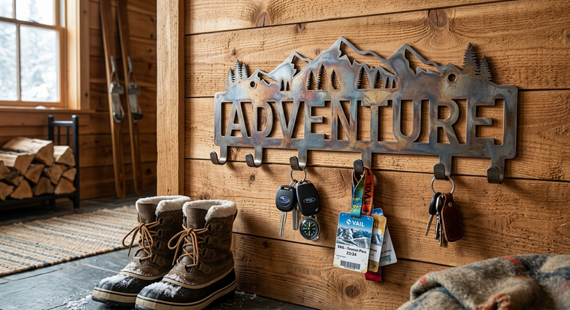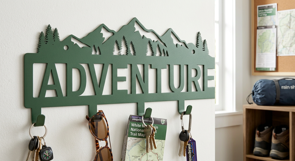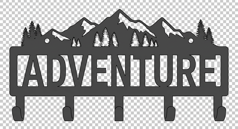 Start every day as an adventure with this Mountain Adventure Key Holder. A mountain range with pine trees crowns the top, while the word "ADVENTURE" cuts through the center, and sturdy hooks below keep your keys and gear organized. Cut as a single piece with mounting holes, it's ideal for cabins, mudrooms, and homes of outdoor enthusiasts.