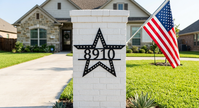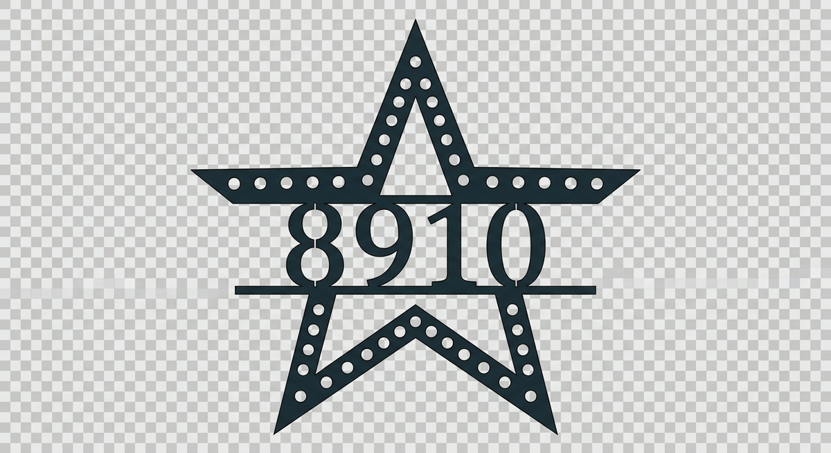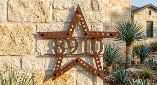 Show your Texas pride and your address with this Texas Star Address Plaque. Your custom house numbers are cut right through the center of a bold five-pointed star, making your home unmistakable. Decorative dot accents add refined detail. Cut as one piece. Built for Texas homes, ranches, and anyone proud to fly the Lone Star.