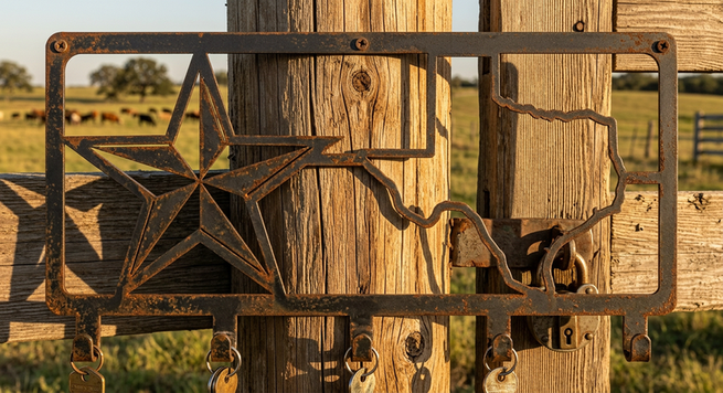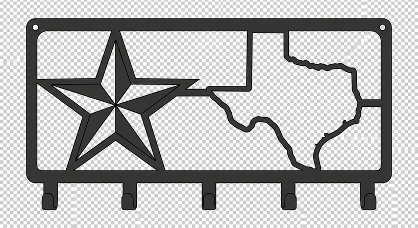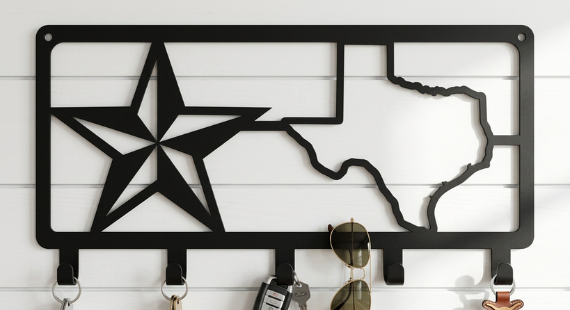 Hang your keys Texas-style with this Texas Star & State Key Holder. A bold Lone Star and a Texas state outline proudly display your roots while sturdy hooks below keep life organized. Cut as a single piece with mounting holes, it's the perfect greeting at any Texas front door, mudroom, or garage.