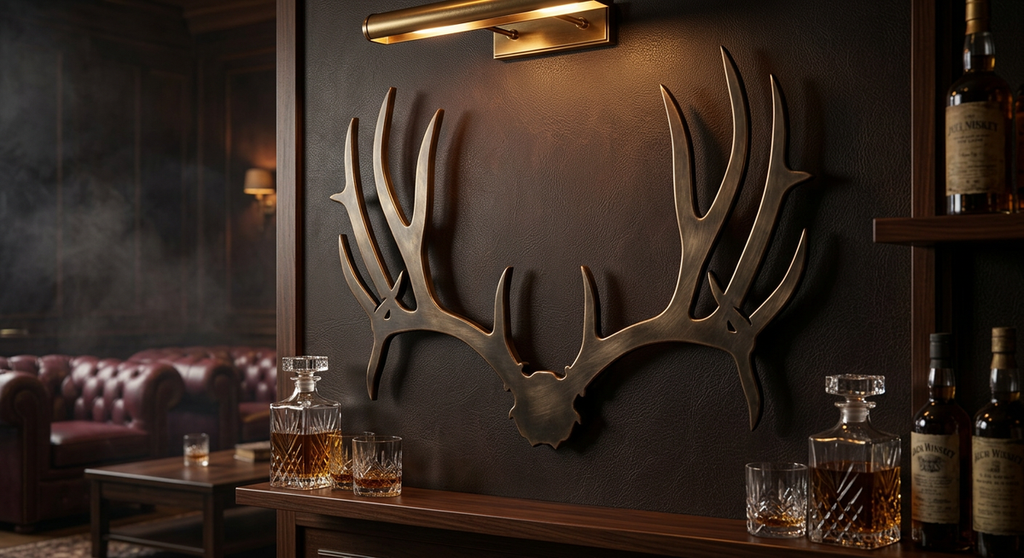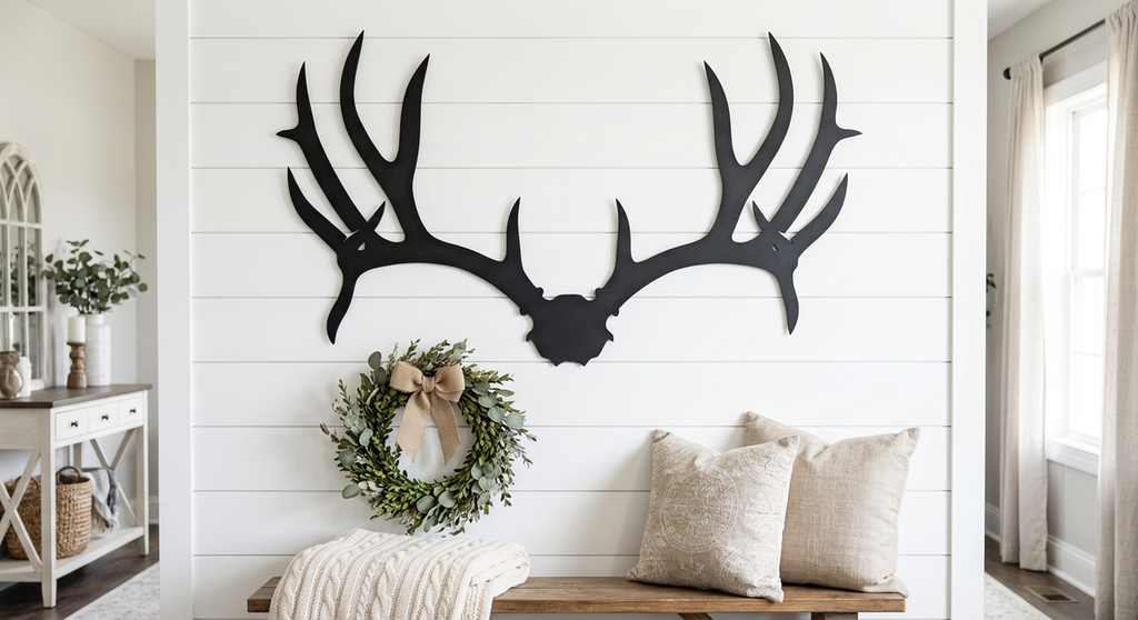 Command attention with this Trophy Deer Antler Rack Metal Wall Art. This impressive symmetrical antler rack features multiple tines branching from sturdy main beams, creating a bold and majestic silhouette. Precision-cut as a single connected piece, it's lighter than real antlers but equally impactful. A centerpiece for hunting lodges, man caves, living rooms, or any space that celebrates the outdoors.