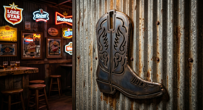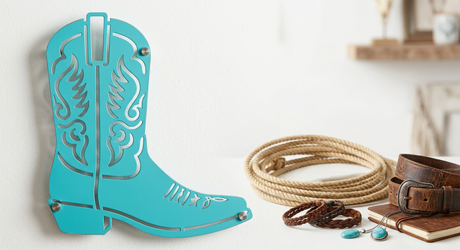Step into Western style with this Western Cowboy Boot Metal Sign. Featuring a classic cowboy boot silhouette with intricate decorative stitching details, this piece captures the essence of Texas boot culture. Precision-cut from quality steel as a single connected piece, every detail from the pointed toe to the pull tabs is rendered beautifully. Hang it in your entryway, mudroom, or Western-themed room for instant cowboy charm.